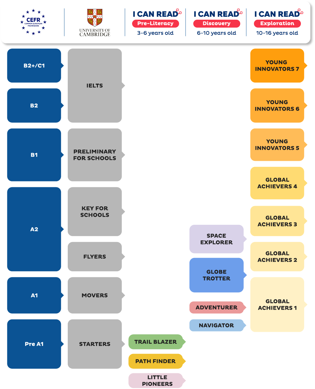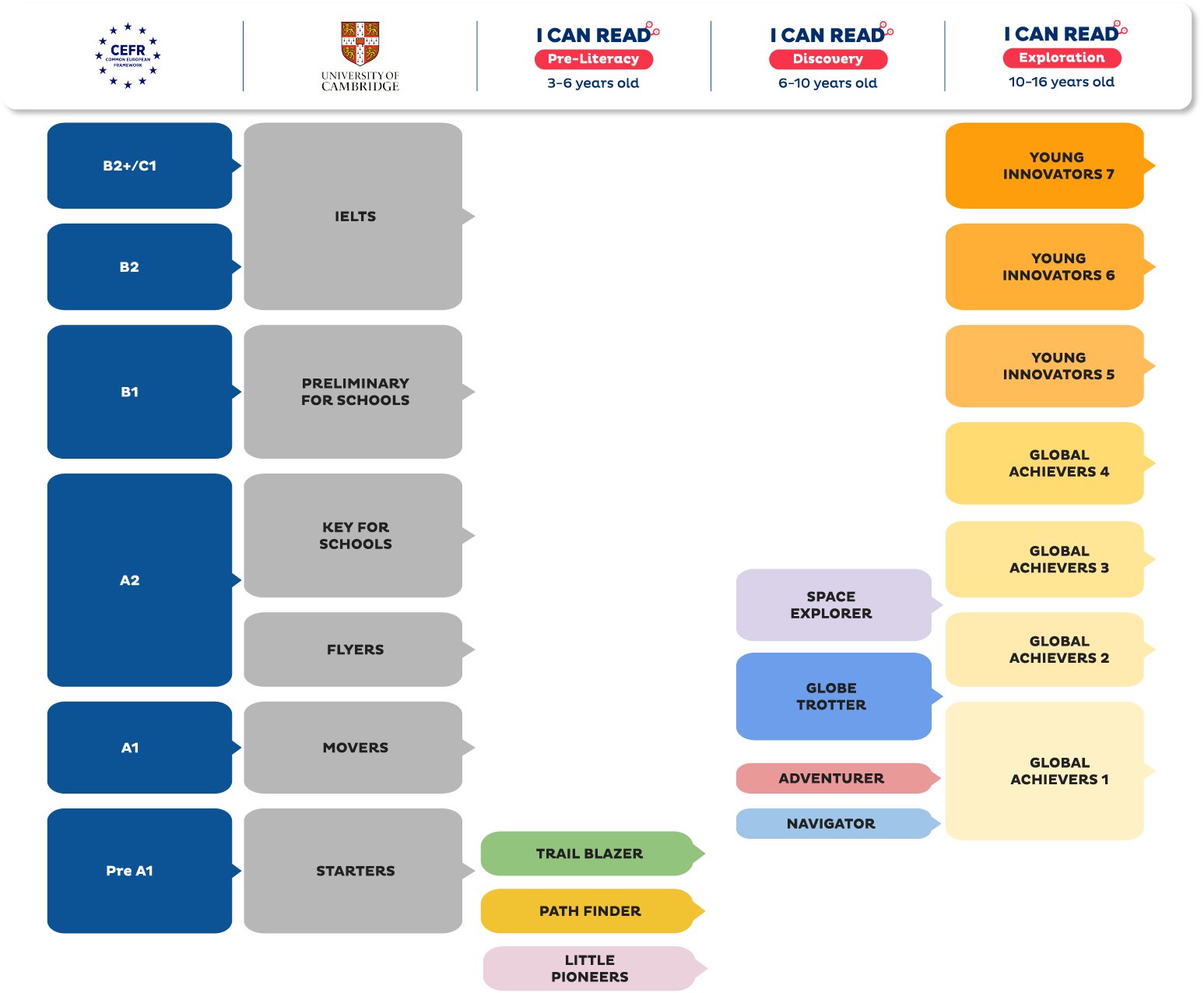 Dựa trên nghiên cứu về sự phát triển tâm lý, ngôn ngữ và giáo dục trẻ em ở độ tuổi trung học, chương trình I Can Read Exploration xây dựng giúp học sinh rèn luyện chuyên sâu 4 kỹ năng Anh ngữ, đồng thời trang bị kiến thức và kỹ năng cần thiết để con sẵn sàng cho các kỳ thi quốc tế và hội nhập toàn cầu.